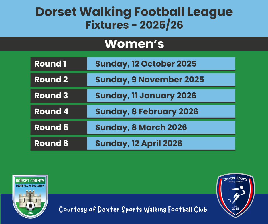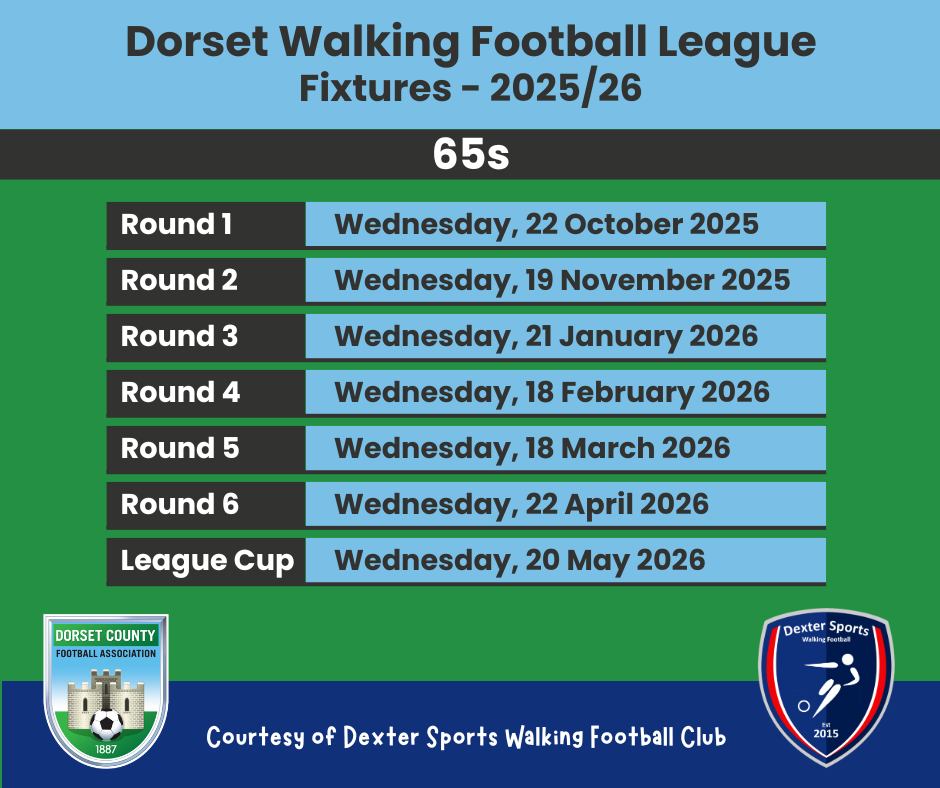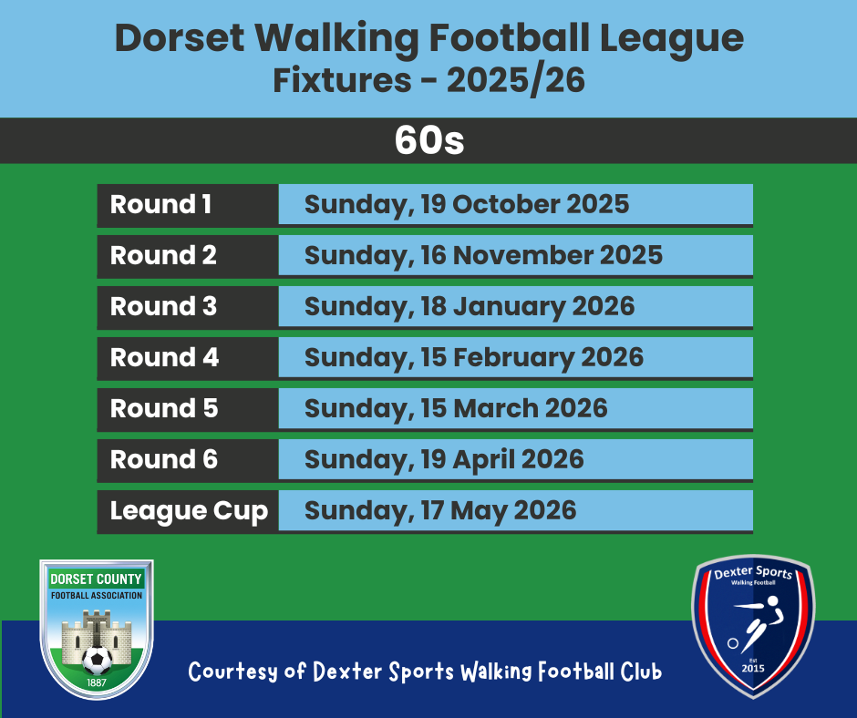 Below you’ll find the full fixture dates for all five categories. For updates on dates, kick-off times and venues, maybe join the Dorset Walking Football League on Facebook. And don’t forget to follow us while you’re there… Dexter Sports Walking Football Club.