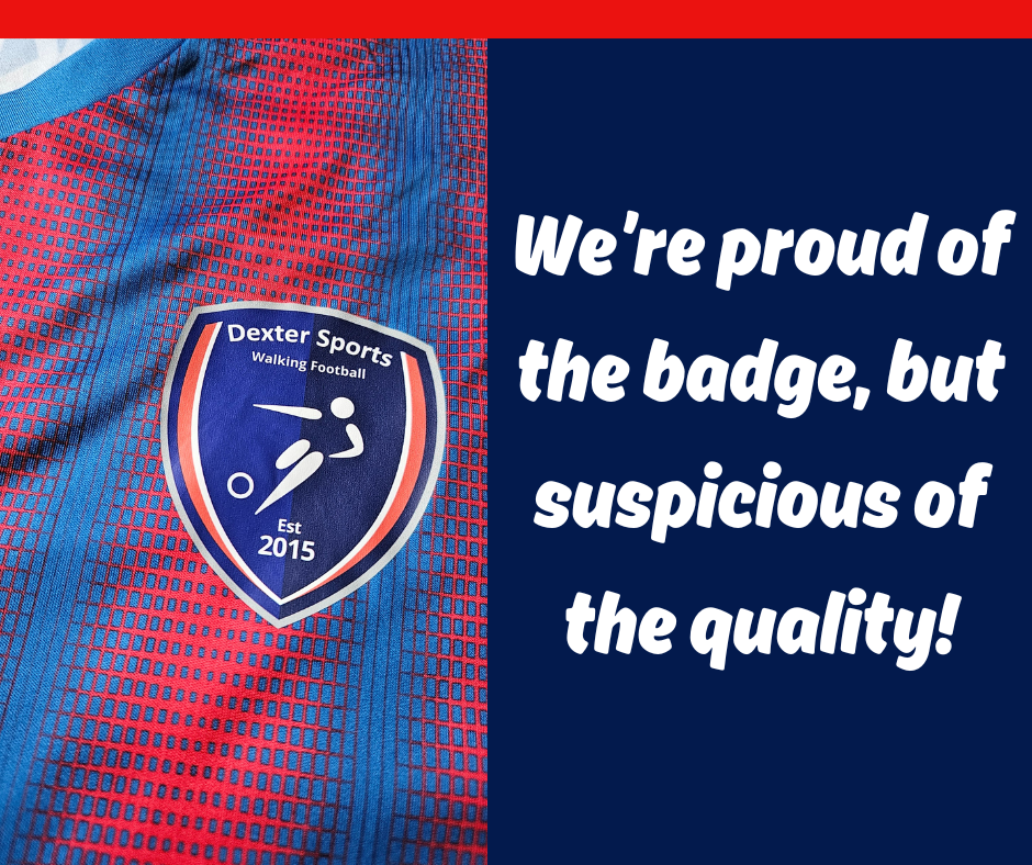 Now then, the club badge! It’s really great to see the walking football version of the Dexters badge being used. It also shows our walking football club has been around since 2015. Indeed, we’ll be celebrating ten years next year. It’s the first time this version of the badge been used on one of our shirts, which is an excellent development. However…